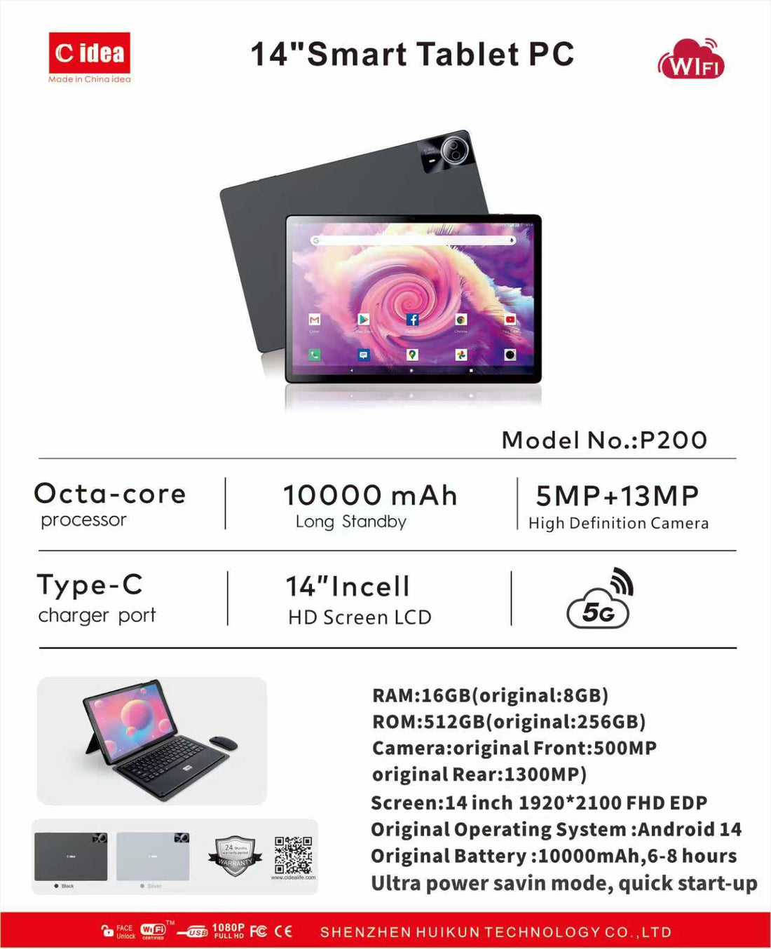 RAM:16GB(original:8GB) ROM:512GB(original:256GB) Camera:originalFront:500MP Original Rear:1300M Screen:14 inch1920*2100FHD EDPOriginalOperatingSystem :Android 14 OriginalBattery:10000mAh,6-8 hours Ultra power savin...